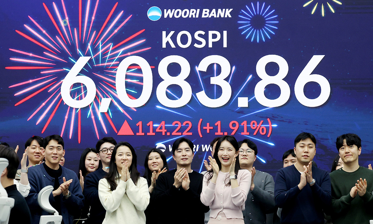 코스피가 사상 첫 6000을 돌파한 2025년 2월 25일 서울 중구 우리은행 딜링룸에서 직원들이 축하 세리머니를 하고 있다. 뉴시스