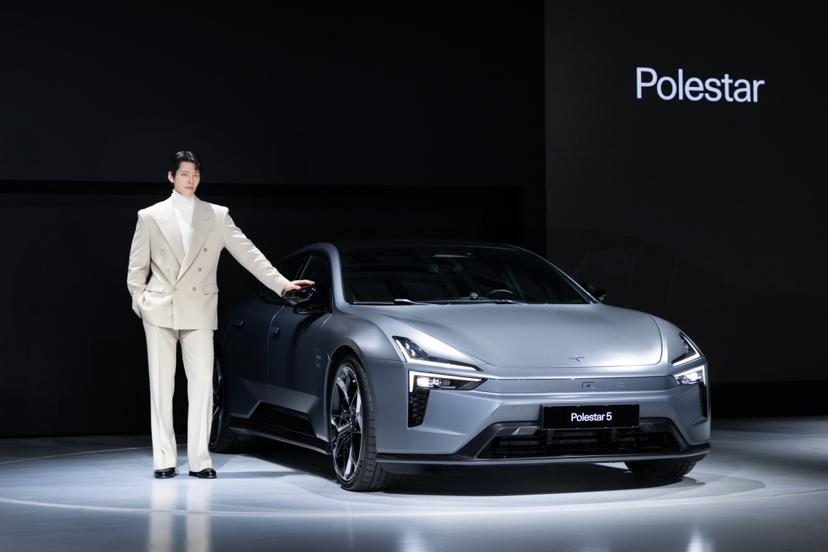 폴스타 브랜드 앰배서더인 김우빈 배우가 올해 3분기 국내 출시 예정인 ‘폴스타 5’ 옆에서 포즈를 취하고 있다. 폴스타코리아 제공