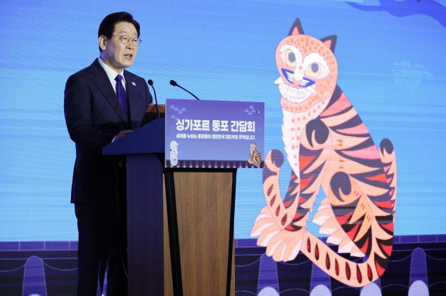 이재명 대통령이 1일 싱가포르 한 호텔에서 열린 동포 만찬간담회에서 인사말을 하고 있다.[사진=연합뉴스] |