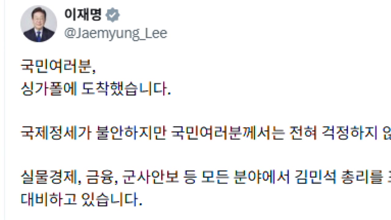 이 대통령은 어제(1일) SNS에, 첫 국빈 방문지로 싱가포르에 도착했단 사실을 알린 뒤, 국제 정세가 불안하지만, 국민 여러분께선 전혀 걱정하지 않으셔도 된다며 이같이 적었습니다.