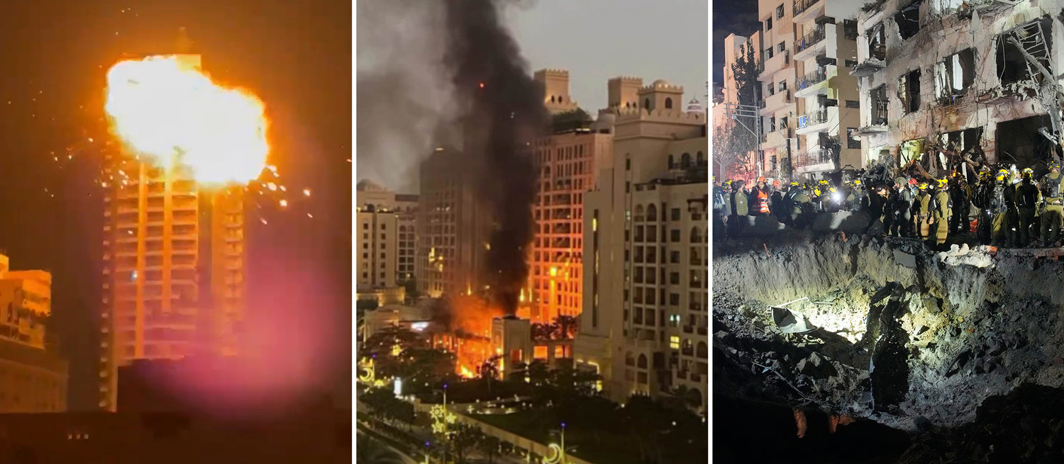 지난달 28일 미국과 이스라엘이 이란을 공습하자 이란 또한 중동 내 친(親)미국 국가, 미군 기지 등을 보복 공격했다. 이란 무인기가 바레인의 한 고층 빌딩을 공격해 거대한 화염이 발생한 모습(왼쪽 사진). 이란의 미사일 파편이 떨어진 아랍에미리트(UAE) 두바이의 페어몬트호텔(가운데 사진). 이란의 미사일 잔해로 건물 인근에 거대한 구멍이 파인 이스라엘 텔아비브의 1일 모습.