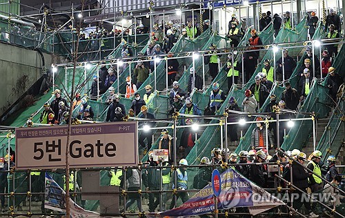계단을 따라 이어진 인파는 30분 넘게 끊이지 않았다. 하루 작업을 마친 근로자들의 얼굴에는 피로가 묻어 있었지만, 휴대전화로 셀카를 찍고 동료의 어깨를 두드리는 모습에는 경쾌함도 엿보였다.