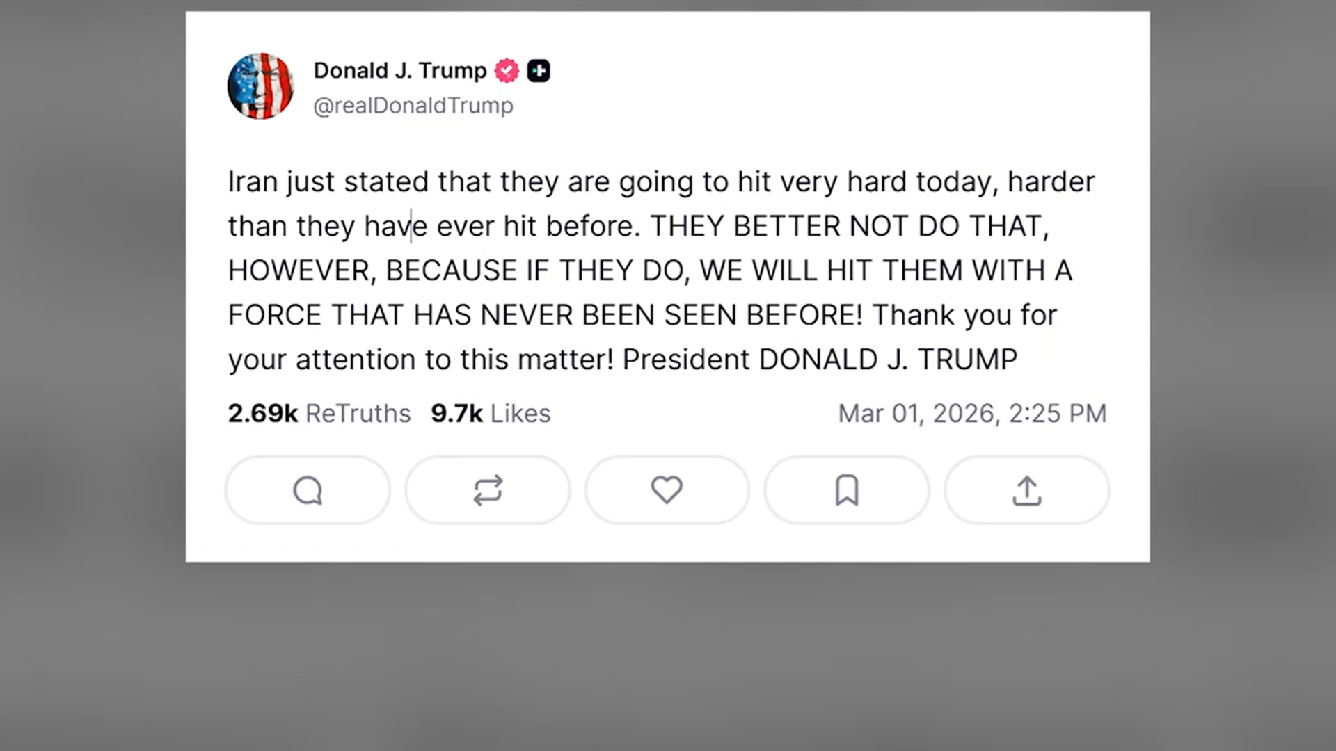 트럼프 대통령은 현지시간 1일 SNS를 통해 이란이 보복하겠다고 말한 점을 언급하며 "만약 그들이 그렇게 한다면 이전에 본 적 없는 힘으로 그들을 타격할 것"이라고 밝혔습니다.