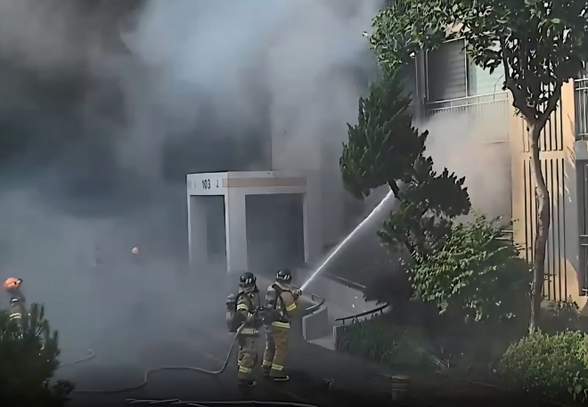 대전의 한 아파트에서 전기적 요인으로 화재가 발생해 소방대원들이 진화하고 있다. 대전소방본부 제공 |