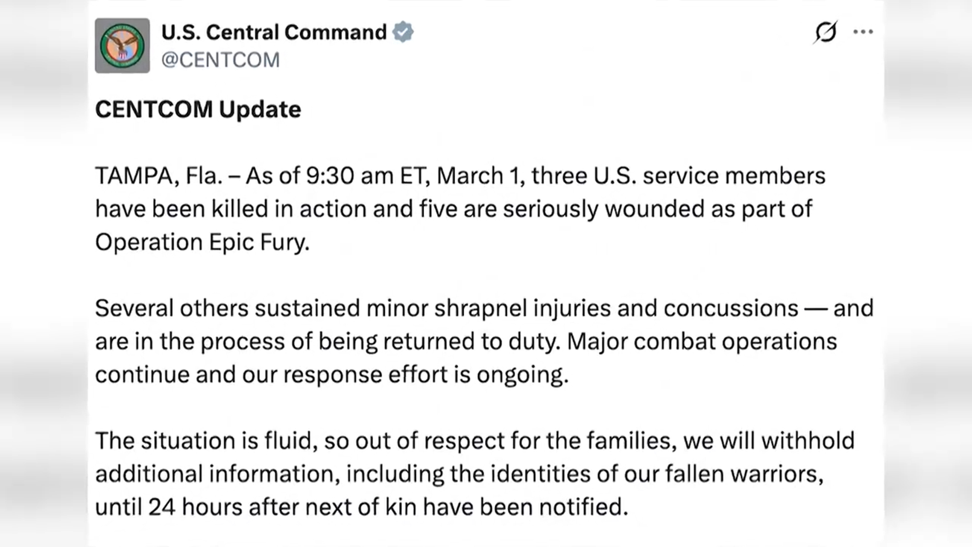 중부사령부는 "전사한 용사들의 신원을 포함한 추가 정보는 유족에게 통보된 지 24시간 후에 공개될 것"이라고 밝혔습니다.