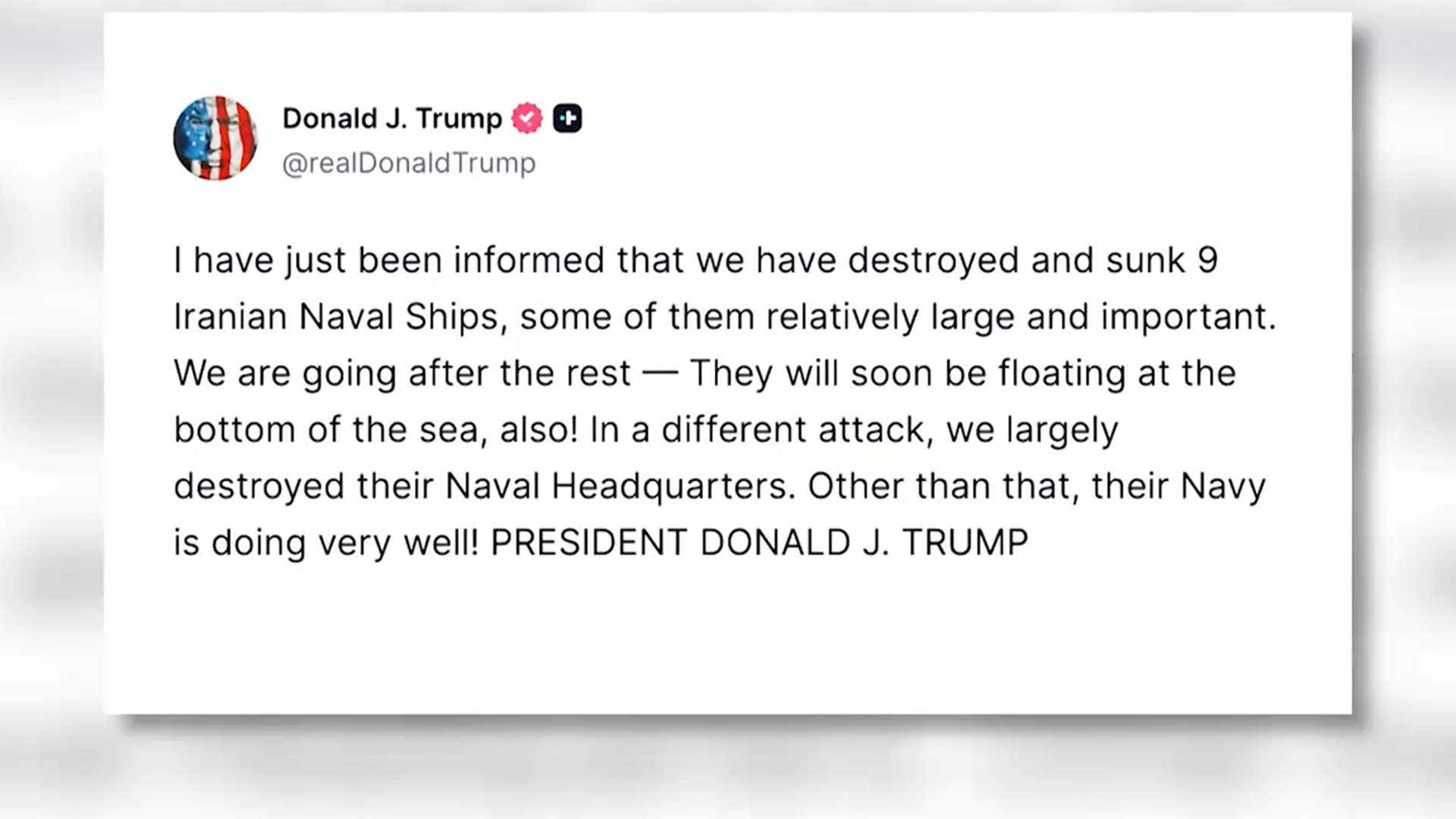 트럼프 대통령은 자신의 SNS를 통해 "이란 해군 함정 9척을 파괴해 격침했으며 그 중 일부는 비교적 규모가 크고 중요한 함정들이었다"고 말했습니다.
