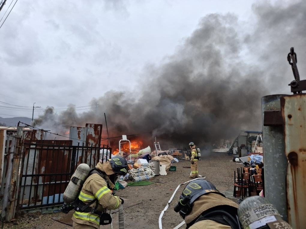 이불은 컨테이너 건물 1개 동과 경량 철골조 건물 1개 동 전체와 고물 등을 태우고 이날 오전 10시 34분쯤 진화됐다.