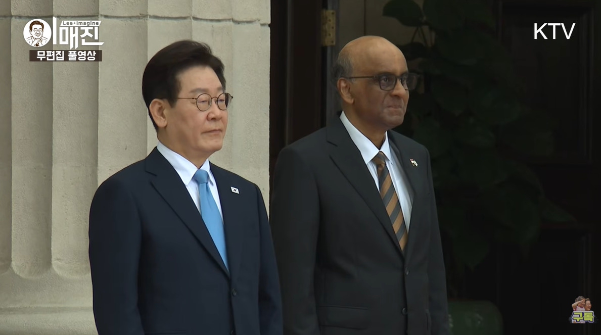 [서울=뉴스핌] 박찬제 기자 = 이재명 대통령이 2일(현지시간) 오전 싱가포르 정부청사 앞에서 타르만 샨무가라트남 대통령과 국빈방문 공식환영식을 하고 있다. [사진=KTV] 2026.03.02 pcjay@newspim.com |