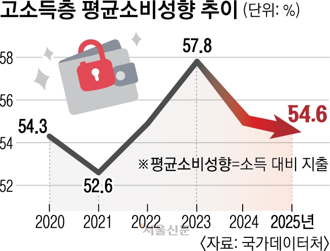 이는 고소득층이 소득이 늘어난 것보다 소비지출을 더 줄였다는 의미다. 지난해 4분기 5분위의 평균소비성향(처분가능소득 중 소비지출 비율)은 54.6%로 지난해 같은 기간보다 0.4% 포인트 떨어졌다. 2021년 4분기 52.6% 이후 4년 만에 가장 낮은 수치다. 평균소비성향 수치가 하락한 건 쓸 수 있는 돈이 있는 데도 쓰지 않았다는 의미다.