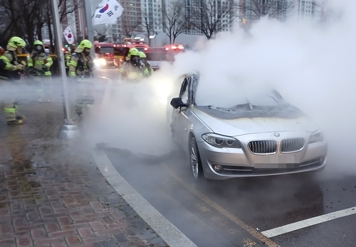 (인천=연합뉴스) 최은지 기자 = 3일 오전 7시 1분께 인천시 연수구 송도동 한 도로에서 달리던 BMW 차량에 불이 났다.
