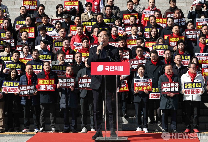 [서울=뉴스핌] 윤창빈 기자 = 송언석 국민의힘 원내대표가 3일 오후 서울 여의도 국회 본청 앞 계단에서 열린 사법독립 헌정수호를 위한 대국민 호소 국민대장정 규탄대회에서 규탄사를 하고 있다. 2026.03.03 pangbin@newspim.com