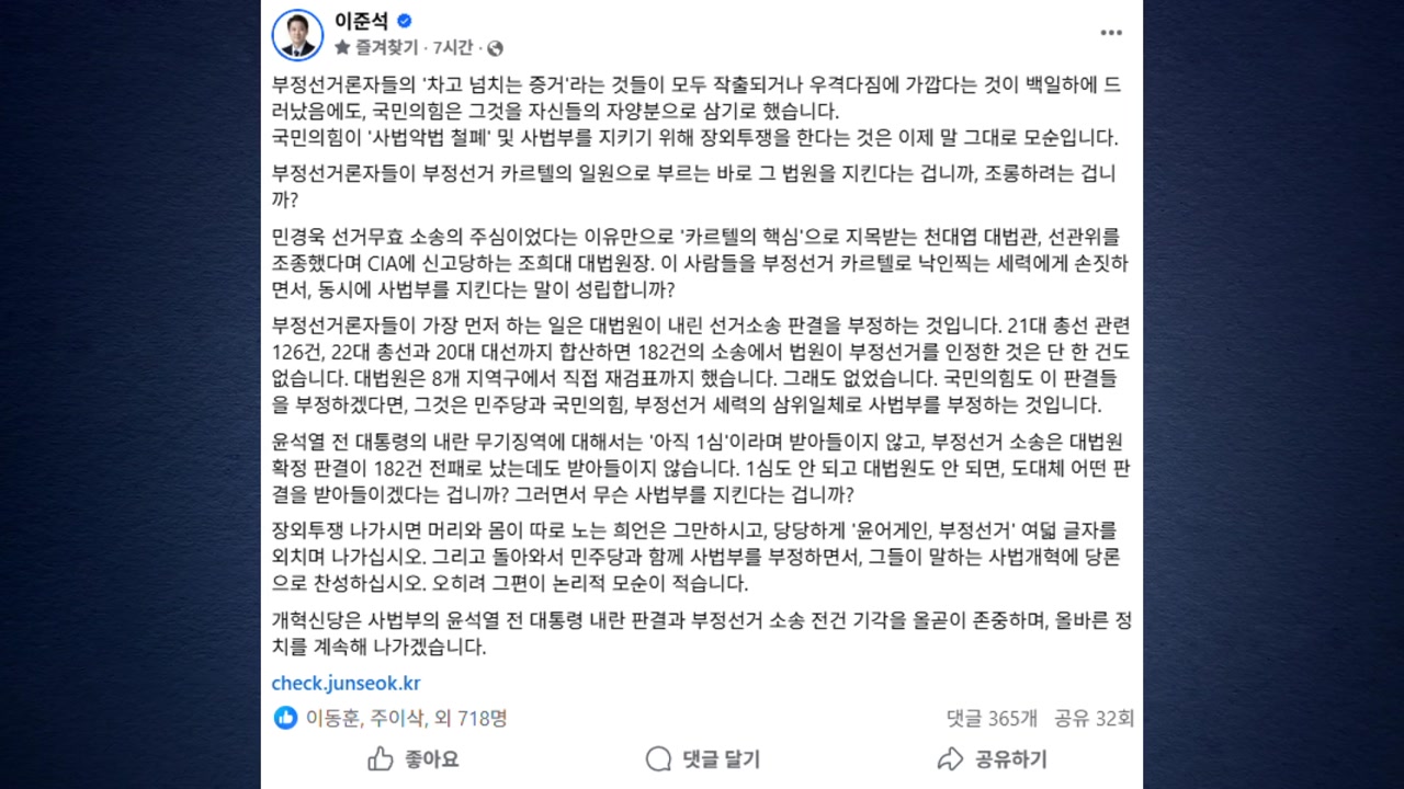 개혁신당 이준석 대표는 부정선거론자 주장을 자양분 삼기로 한 국민의힘이 사법부를 지키기 위해 장외투쟁을 하는 것 자체가 모순이라고 비판했습니다.