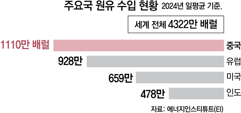 지난해 4월 열린 미중 경제안보검토위원회 청문회에 따르면 2024년 중국의 하루 평균 원유 수입량은 약 1110만 배럴에 달한다. 이 가운데 약 140만 배럴, 전체의 13% 가량이 이란산으로 추산된다. 중국은 이란 해상 원유 수출 물량의 80% 이상을 사들이는 최대 고객이기도 하다.