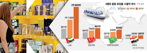 K뷰티 기업들도 중동 시장에 공을 들여왔다. 대표적으로 CJ올리브영은 지난해 11월 현지 유통기업 라이프헬스케어그룹(LHG)과 K뷰티 브랜드의 입점을 위한 양해각서(MOU)를 체결했다. 지난해 10월 열린 중동 최대 규모의 뷰티 박람회 ‘두바이 뷰티월드 2025’에는 메디큐브(에이피알), 애경산업, 코스알엑스(아모레퍼시픽), 센텔리아24(동국제약) 등 274개 K뷰티 브랜드·기업이 참가하기도 했다. 이 밖에도 실리콘투는 지난해 두바이에 법인을 세우고 4분기부터 물류창고 가동을 시작했으며, 다수의 뷰티 브랜드들이 현지 뷰티체인 등에 공식 입점해 현지 소비자들을 만나고 있다.