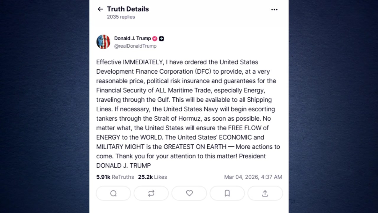 또 "미국 국제금융개발공사에 걸프 지역을 통과하는 모든 해운, 특히 에너지 운송에 대해 정치적 위험 보험과 보증을 매우 합리적인 가격에 제공하도록 지시했다"고 덧붙였습니다.