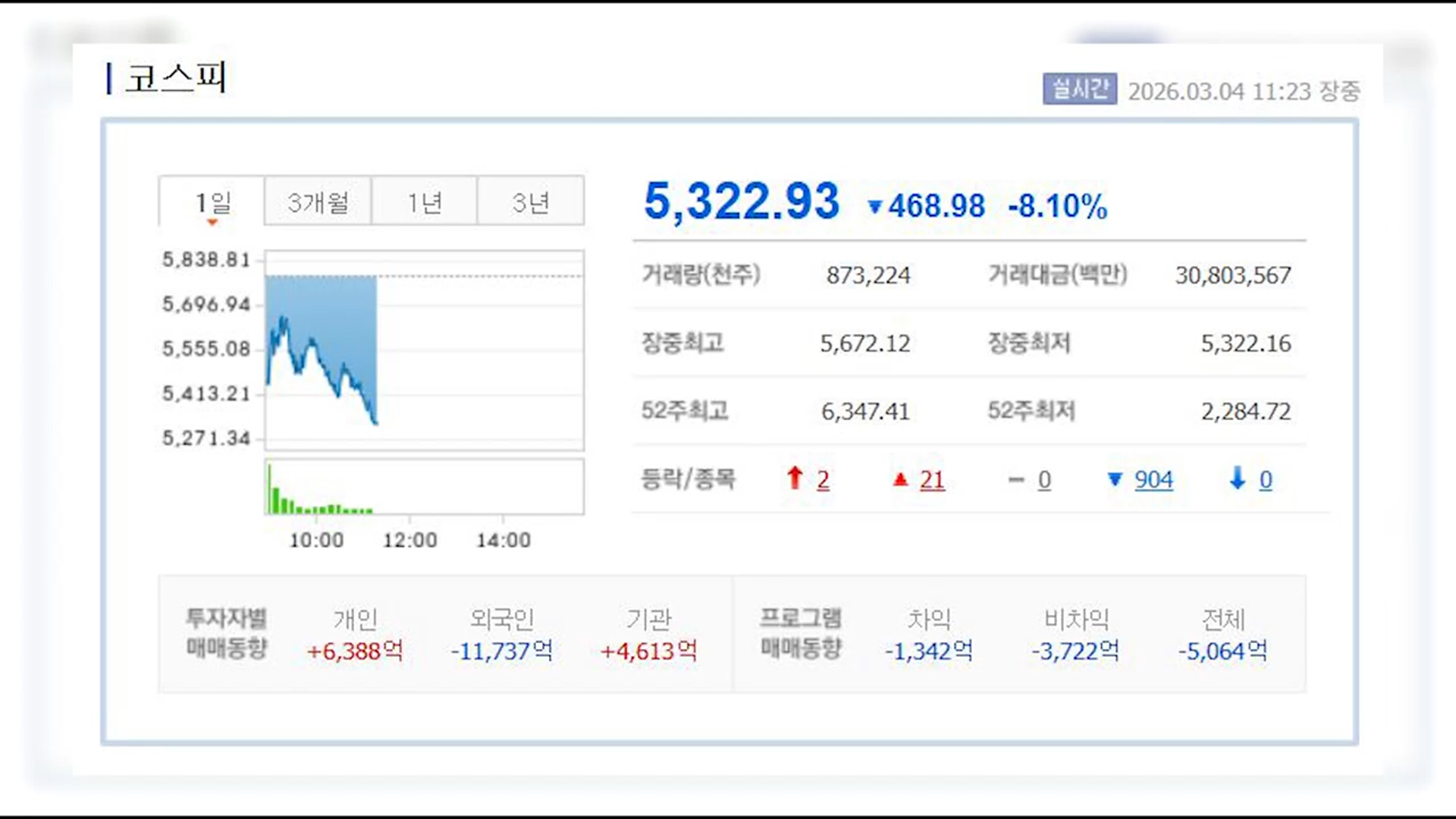 유가증권시장에서는 외국인이 대거 매도하고 있고 개인과 기관이 사고 있습니다.