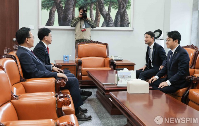 [서울=뉴스핌] 윤창빈 기자 = 한병도 더불어민주당 원내대표, 천준호 원내운영수석부대표, 송언석 국민의힘 원내대표, 유상범 원내수석부대표가 19일 서울 여의도 국회에서 여야 원내대표 회동을 하고 있다. 2026.01.19 pangbin@newspim.com |