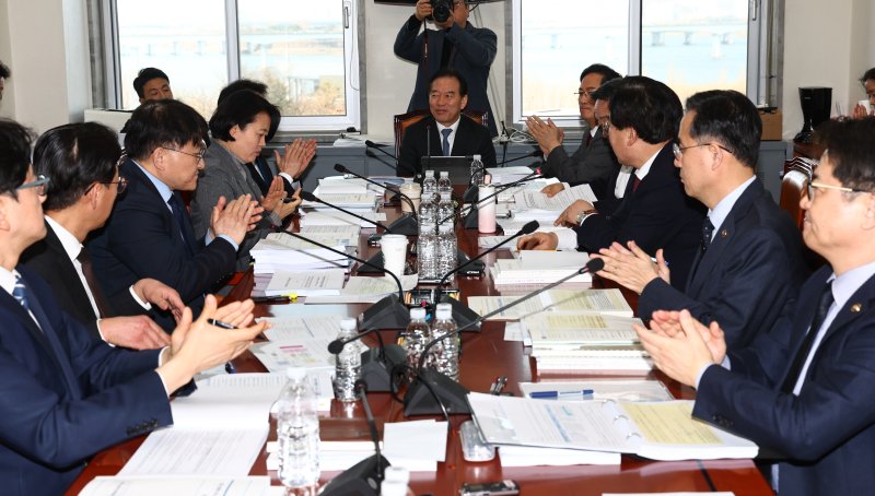 국회 '대미투자특별법 처리를 위한 특별위원회'가 4일 회의를 개최했다. 정태호 대미투자특위 법안소위원장(가운데)이 국회에서 회의를 시작하면서 여야 의원들과 함께 박수를 치고 있다. 뉴시스 |