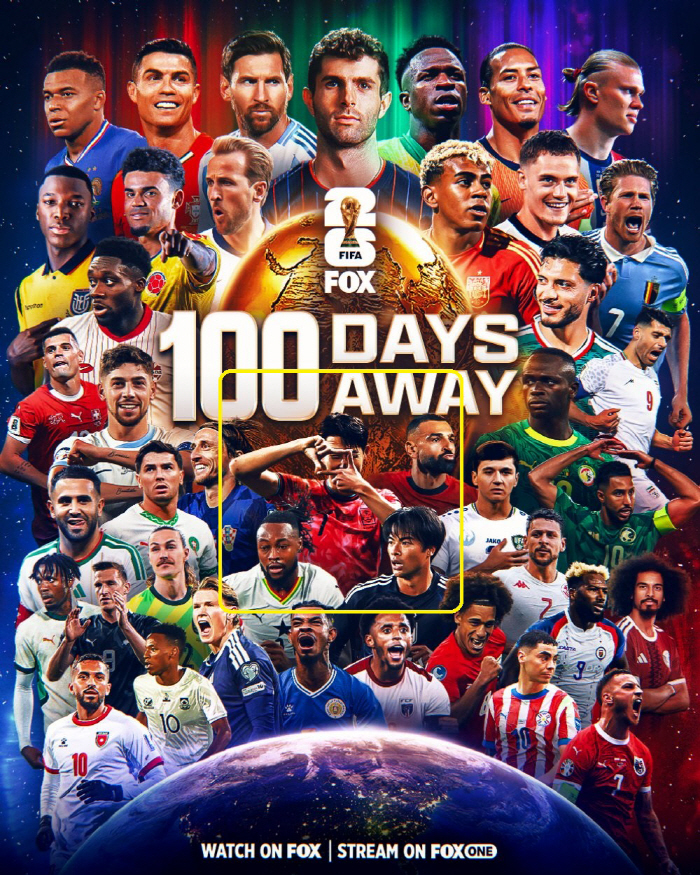 미국 방송 '폭스스포츠'는 3일(현지시각) SNS를 통해 월드컵 D-100 기념 포스터를 올렸다. 오는 6월 개막하는 북중미월드컵을 빛낼 각국 대표 스타 선수들을 한데 모았다.