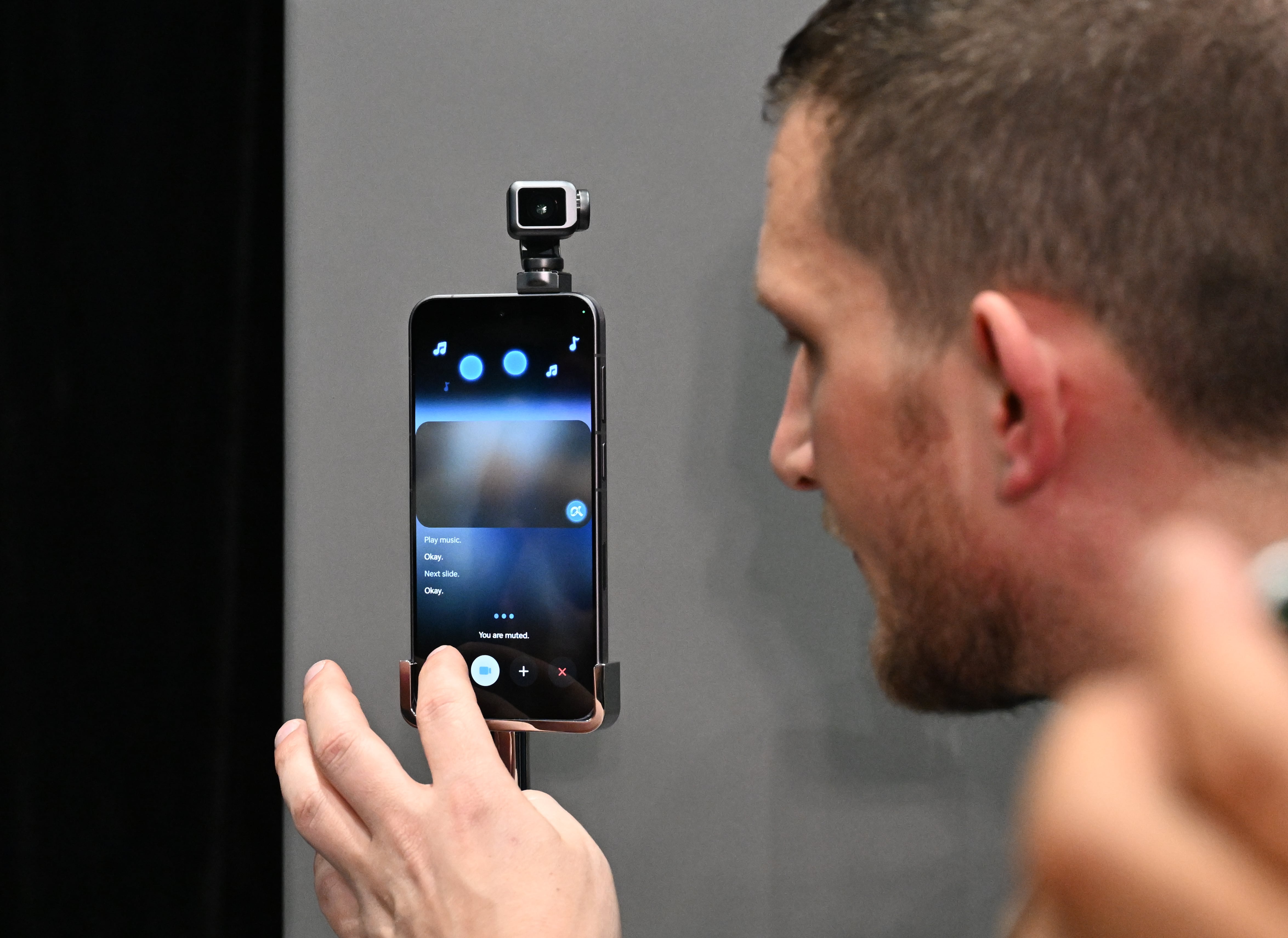 MWC 2026에서 전시 관계자가 중국의 스마트폰 브랜드 아너가 공개한 '로봇폰'을 만져보고 있다. 이 폰은 접혔다 펴지는 로봇팔에 카메라가 달려 360도 회전하며 촬영한다. /신화 연합뉴스 |