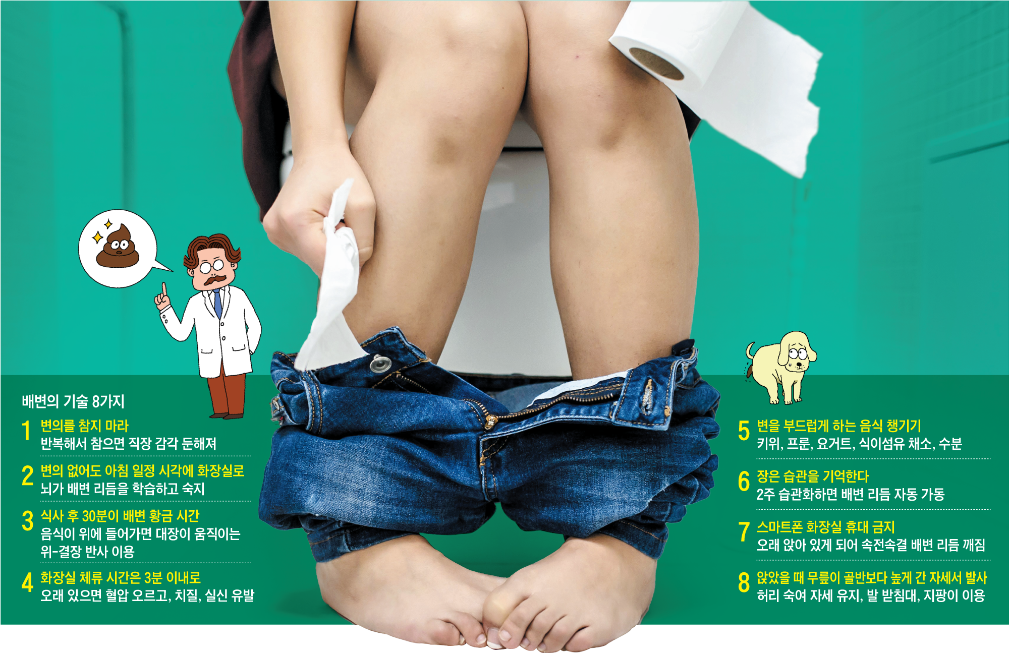 화장실에 짧게 머물러 있는 기술을 펼쳐야 한다. 많은 사람이 변비가 있으면 화장실에서 오래 앉아 있다. 이는 좋은 방법이 아니다. 권장 시간은 3분 이내다. 자주 오래 배에 힘을 주고 있으면 혈압이 오르고, 치질 위험이 커진다. 화장실에서 오래 앉아 있다가 갑자기 일어나면 실신 위험까지 생긴다. 배변 기술의 핵심은 ‘규칙적이고 리듬감 있게 속전속결하는 것’이다.