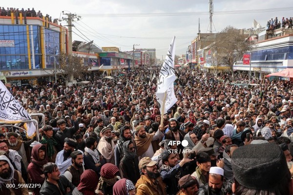 (아프가니스탄=국제뉴스) 박원준 기자 = 4일(현지시간) 파키스탄과 아프가니스탄 간 국경 분쟁이 계속되는 가운데 아프간 파크티아 주 가르데즈에 남성들이 탈레반 대원들을 지지하기 위해 모여있다.