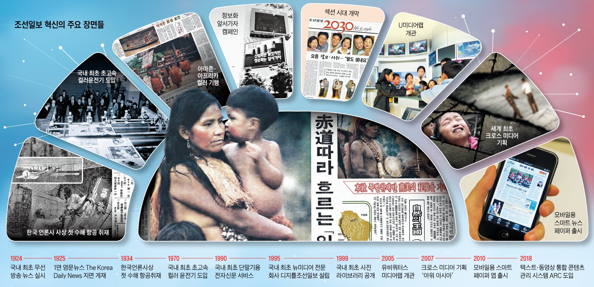 1920년 3월 5일 창간한 조선일보가 걸어온 지난 106년은 혁신을 거듭해 온 역사였다. 일제강점기 민족 계몽과 독립에 대한 염원을 담아 창간된 신문은 한 세기를 넘는 시간 동안 기술과 편집, 경영, 플랫폼 측면에서 무수한 혁신을 통해 신문과 방송, 인터넷을 망라하는 종합미디어그룹으로 성장했다.