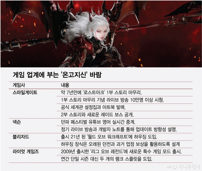국내외를 막론하고 게임업계에 옛것을 익혀 새로움을 안다는 '온고지신' 열풍이 불고 있다. 출시된 지 10년 넘은 장수게임들이 새로운 클래스와 스토리를 출시하고 환경에 변화를 줘 유저들을 '록인'(Lock-in)하는 모습이다.