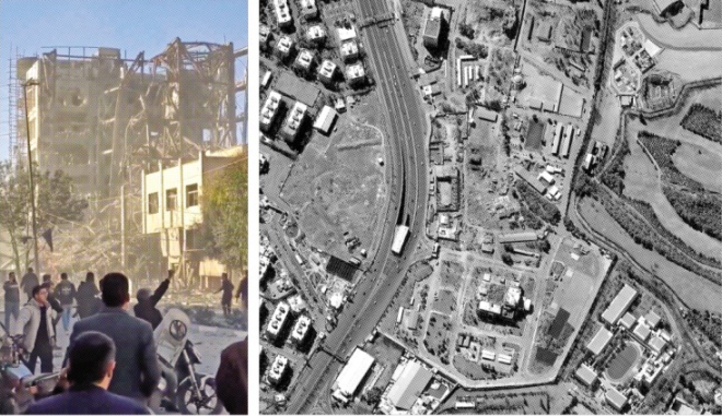 공격당한 이란 전문가회의 청사와 혁명수비대 본진 - 3일(현지시간) 이란 중부 종교도시 쿰에 있는 전문가회의 청사가 이스라엘군의 폭격으로 붕괴됐다. 무너진 건물 사이로 철제 골조가 그대로 드러나 있다(왼쪽 사진). 오른쪽 사진은 테헤란에 있는 이란 이슬람혁명수비대(IRGC) 본부 건물 일부가 공습으로 파괴된 모습을 포착한 위성사진. 쿰·테헤란 로이터·AP 연합뉴스 |