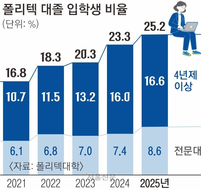 특히 전문대를 졸업한 입학생 비율은 2021년 6.1%에서 2025년 8.6%로 4년 새 2.5% 포인트 소폭 늘어난 반면 4년제 대학 이상 교육기관을 졸업한 입학생은 2021년 10.7%에서 2025년 16.6%로 같은 기간 5.9% 포인트 상승했다. 취업난이 심화하자 학사 학위자들이 다시 기계·디자인·반도체 등 취업 가능성이 높은 분야의 기술을 터득해 돌파구를 찾는 것으로 풀이된다.