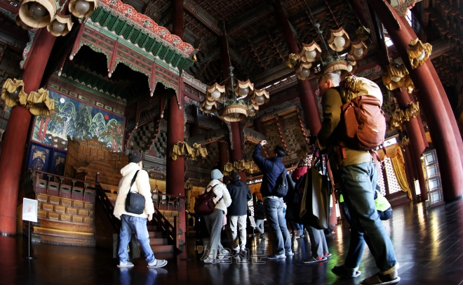 창덕궁 인정전 내부 공개 - 외국인을 비롯한 관광객들이 4일 서울 종로구 창덕궁 인정전에서 ‘해설과 함께 만나는 창덕궁 으뜸전각, 인정전 내부 관람’ 특별 프로그램에 참여하고 있다. 국가유산청은 이달 매주 수요일부터 일요일까지 평소 밖에서만 볼 수 있었던 인정전 내부를 공개 운영한다. 홍윤기 기자 |