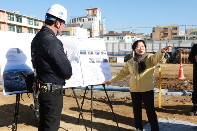 김미경(오른쪽) 은평구청장이 지난달 25일 갈현초 그린스마트 미래학교 및 복합화시설 공사 현장을 찾아 안전 점검을 하고 있다. 은평구 제공 |