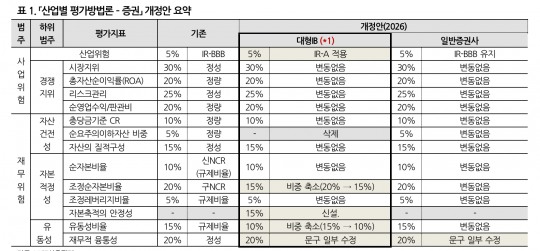 체급이 달라진 대형 IB를 일반 증권사와 다른 평가 체계를 적용해야 한다는 취지다. 자기자본투자(PI)와 주주환원 강화 등 자본활용과 배분 중요성이 커지는 시장 환경도 고려해야 한다는 의견이다.