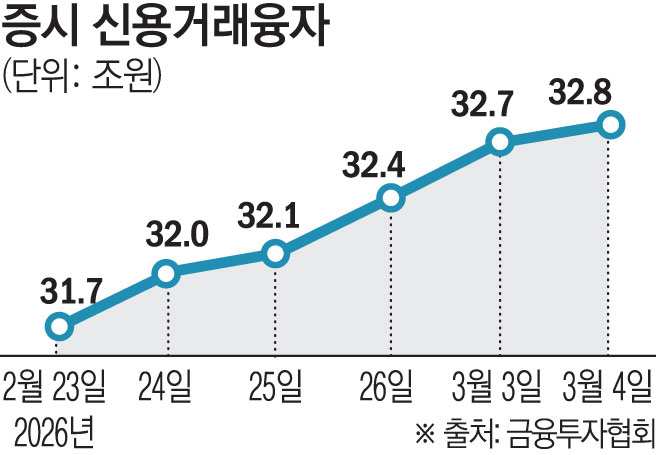 5일 금융투자협회에 따르면 3일 기준 신용거래융자 잔고는 32조8040억원을 기록하며 지난달 27일(32조6689억원)에 이어 사상 최고치 행진을 이어갔다. 전날 코스피 지수가 5093.54에 장을 마치며 전월 26일 6307.27에서 불과 3거래일 만에 1100포인트 이상 증발했음에도 신용거래융자는 계속해서 늘어나고 있다.