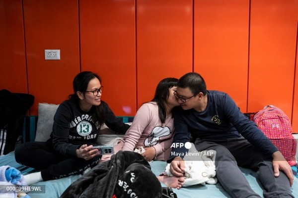 1일 이스라엘 텔아비브에서 이란의 로켓 공격이 계속되는 가운데 한 가족이 기차역에 대피해 있다. 국제뉴스/AFP통신 |