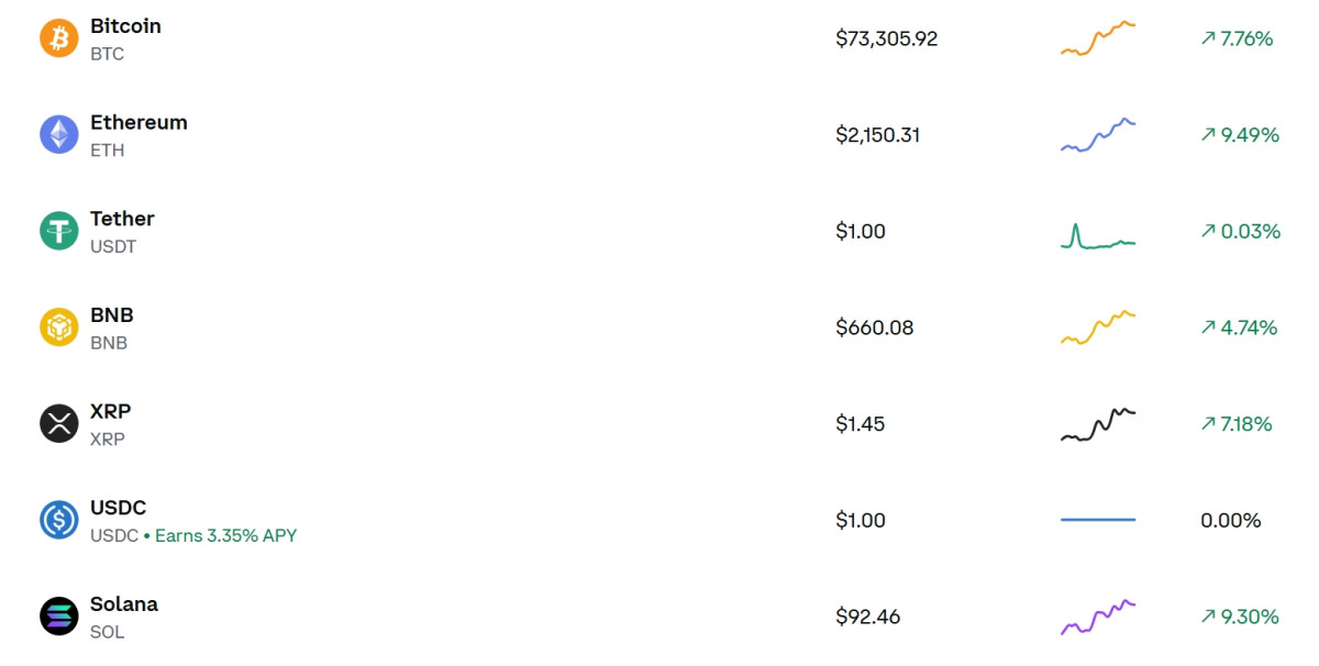 한국시간 5일 오전 6시 45분 기준 글로벌 거래소 코인베이스에 따르면 주요 암호화폐 가격은 대부분 큰 폭으로 상승했다. 비트코인은 7만3305달러 선에서 거래되며 전일 대비 7.76% 상승했다.