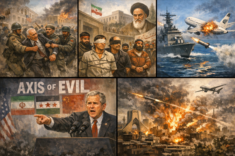 미국과 이란의 역사적 순간들. 상단 왼쪽부터 아약스 작전(1953)→이란 인질 사태(1979)→민항기 격추(1988)→하단 왼쪽부터 악의 축 선포(2002)→에픽퓨리 작전(2026). 챗GPT 제공 |