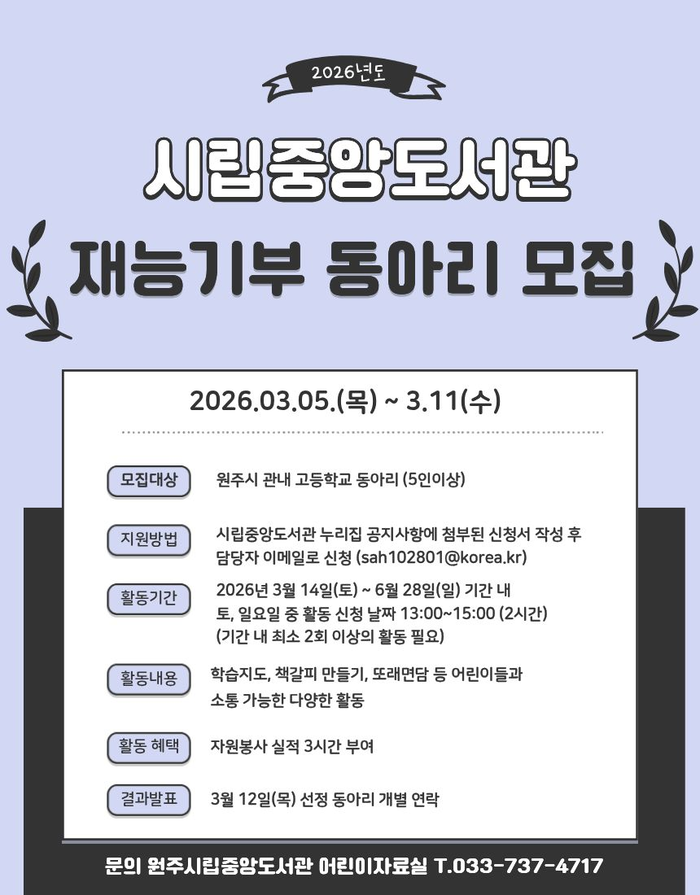 [스포츠서울ㅣ원주=김기원 기자]원주시립중앙도서관은 올해 상반기 청소년 재능기부 동아리 봉사활동에 참여할 관내 고등학교 동아리 학생들을 모집한다.