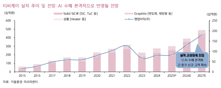박유악 키움증권 연구원은 "티씨케이의 2026년 실적 전망치를 매출액 3916억원과 영업이익 1320억원으로 상향 조정한다"며 "AI용 eSSD 수요 확대로 인해 고객들의 신규 NAND 제품(9세대 NAND)의 양산이 본격화되고 있다. 티씨케이의 SiC 포커스링은 9세대 NAND에서 단위당 사용량이 크게 증가하고, AI용 eSSD 수요 확대의 큰 수혜를 볼 전망"이라고 설명했다.