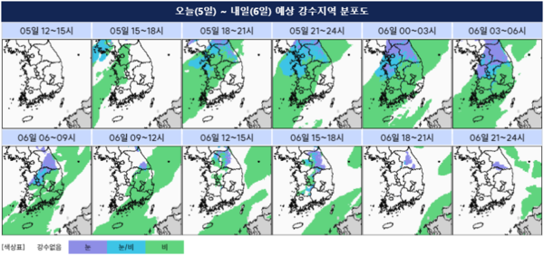 서해상에서 동쪽으로 이동하는 비구름대의 영향으로, 오늘(5일) 늦은 오후 15~18시 사이 수도권과 강원북부내륙, 충청권, 전북에 비나 눈이 시작되겠고, 밤 18~24시에는 전국으로 확대되겠다. 비나 눈은 수도권 기준으로 내일(6일) 새벽 00~06시까지, 그 외 대부분 지역은 오전 06~12시면 그칠 것으로 전망됐다. 제주도의 경우 낮 12~15시까지 비 또는 눈이 이어지는 곳이 있겠다. 한편, 중부지방과 전북에서는 내일 오후 12~18시부터 밤 18~24시 사이에 가끔 비나 눈이 내릴 가능성도 제기됐다. 강원북부동해안은 모레(7일) 새벽 00~06시에 비나 눈이 오겠다.