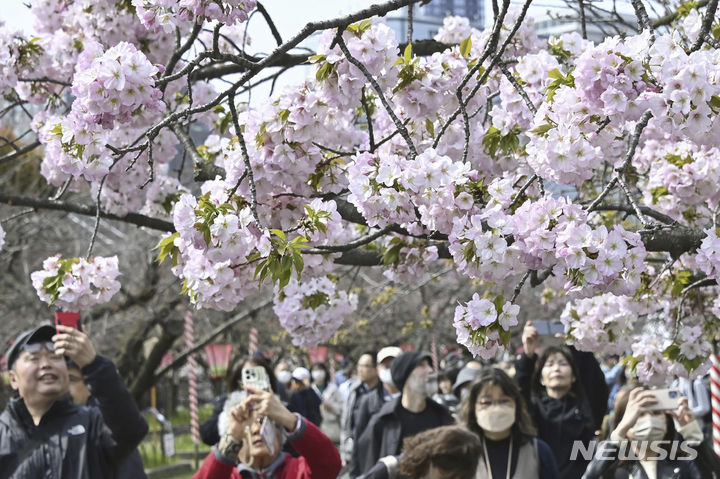 [도쿄=AP/뉴시스] 5일 일본 도쿄 우에노 공원에서 방문객들이 만개한 벚꽃을 촬영하고 있다. 추운 날씨로 예상보다 늦게 핀 벚꽃을 즐기려는 인파가 공원에 몰려들었다. 2024.04.05. |