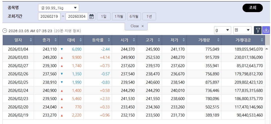미니금(100g 기준)도 비슷한 흐름을 보였다. 3일에는 24만9800원으로 4.13% 상승했으나 4일에는 24만3470원으로 2.53% 하락했다.