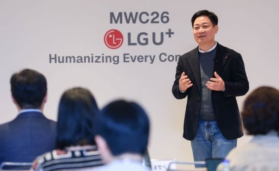 홍범식 LG유플러스 대표가 4일(현지시간) 스페인 바르셀로나 인터콘티넨탈호텔에서 열린 기자간담회에서 'AI 사업전략'에 대해 발표하고 있다.