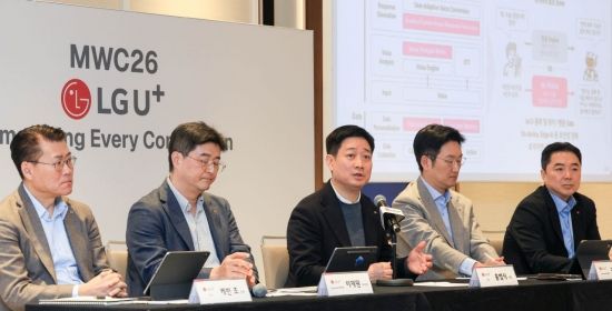 홍범식 LG유플러스 대표(가운데)가 4일(현지시간) 스페인 바르셀로나 인터콘티넨탈호텔에서 열린 기자간담회에서 'AI 사업전략'에 대한 발표를 마친 뒤 취재진 질문에 답하고 있다. 왼쪽부터 케빈 조 LG유플러스 CSO, 이재원 LG유플러스 컨슈머부문장, 홍범식 대표, 권용현 LG유플러스 엔터프라이즈부문장, 이상엽 LG유플러스 CTO.