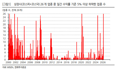 안현국 한화투자증권 연구원은 5일 보고서에서 “전 업종이 5% 이상 동반 하락한 것은 매우 드문 현상”이라며 “포트폴리오 조정보다 시장 전체를 던지는 공포 매도가 핵심”이라고 진단했다.