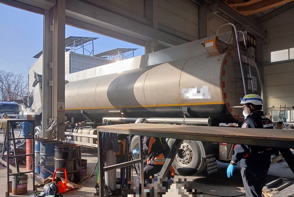 5일 경북소방본부에 따르면 전날 오후 4시1분쯤 칠곡군 왜관읍 아곡리의 한 자동차정비공장에서 탱크로리 용접 작업 중 유증기 폭발로 추정되는 화재가 발생했다.