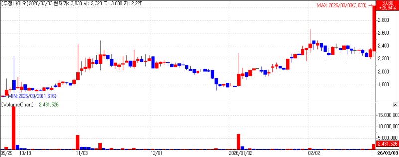 이날 KG제로인 엠피닥터(MP DOCTOR·옛 마켓포인트)에 따르면 우정바이오는 전 거래일 대비 약 25% 급등한 2945원에 거래를 마쳤다. 정규장이 끝나고 시간외 거래에서도 16시 기준 3030원으로 약 29%의 상승률을 유지했다. 최근 잇따라 발표된 글로벌 파트너십 소식이 뒤늦게 본격 반영되며 강한 매수세가 유입된 것으로 풀이된다.