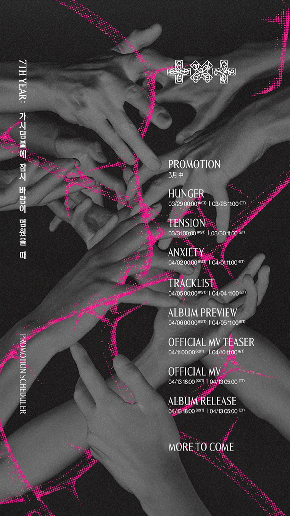 투모로우바이투게더(수빈, 연준, 범규, 태현, 휴닝카이)는 5일 0시 팀 공식 SNS에 미니 8집 ‘7TH YEAR: 가시덤불에 잠시 바람이 멈췄을 때’ 프로모션 스케줄러를 공개했다. 흑백 톤의 이미지 속 뒤엉킨 멤버들의 손 사이로 형광빛 가시덤불이 뻗어 나간다. 대비를 이루는 색감과 가시를 시각화 한 상징적인 오브제가 어우러져 강렬한 인상을 남긴다.