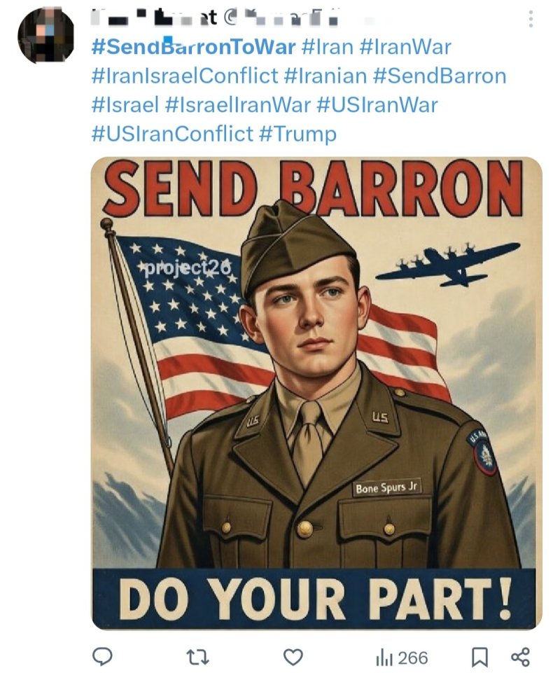 [서울=뉴시스]미국과 이스라엘의 대이란 군사작전으로 미군 사망자가 발생하자도널드 트럼프 대통령의 막내아들 배런 트럼프의 입대를 촉구하는 해시태그가 미국 사회관계망서비스(SNS)에서 확산하고 있다. (사진출처: 엑스 캡처) 2026.03.04. /사진=뉴시스 |