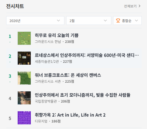 이외에도 세종미술관의 ‘서양미술 600년-미국 샌디에이고 뮤지엄 특별전’과 ‘워너 브롱크호스트: 온 세상이 캔버스’가 상위권에 이름을 올리며 2월의 주요 전시로 꼽혔다.